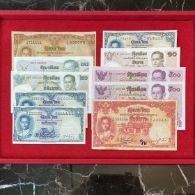 ธนบัตรแบบ 8 พิมพ์ที่บริษัททิวดอร์ รัฐแมนซาชูเซทท์ ประเทศสหรัฐอเมริกา ผลิตขึ้นทั้งหมด 5 ชนิดราคา ได้แก่ 1 5 10 20 และ 100 บาท โดยธนบัตรชนิดราคา 20 และ 100 บาท จะมีรูปร่างและขนาดยาวคล้ายธนบัตรดอลล่าร์ของสหรัฐอเมริกา นักสะสมเรียกธนบัตรรุ่นนี้ว่า “แบงค์อเมริกัน”